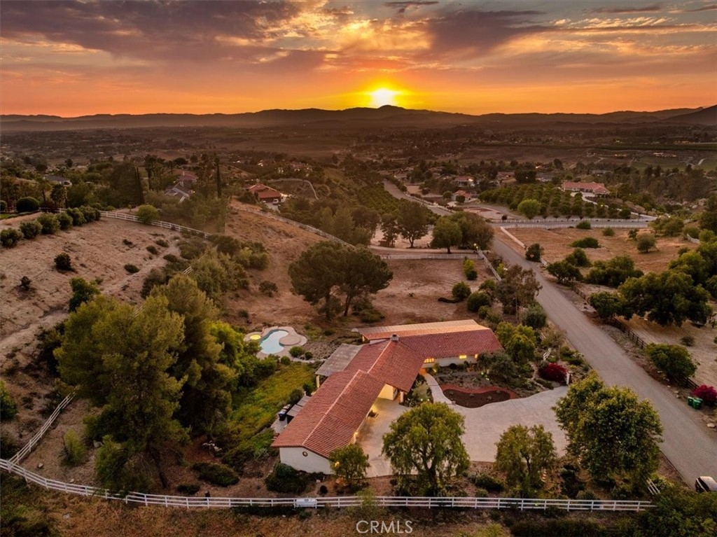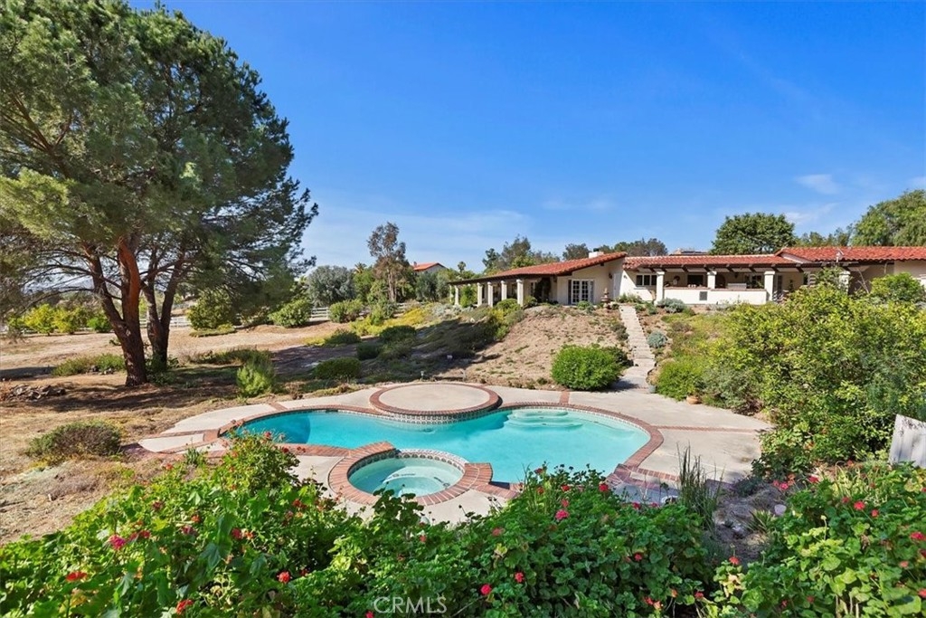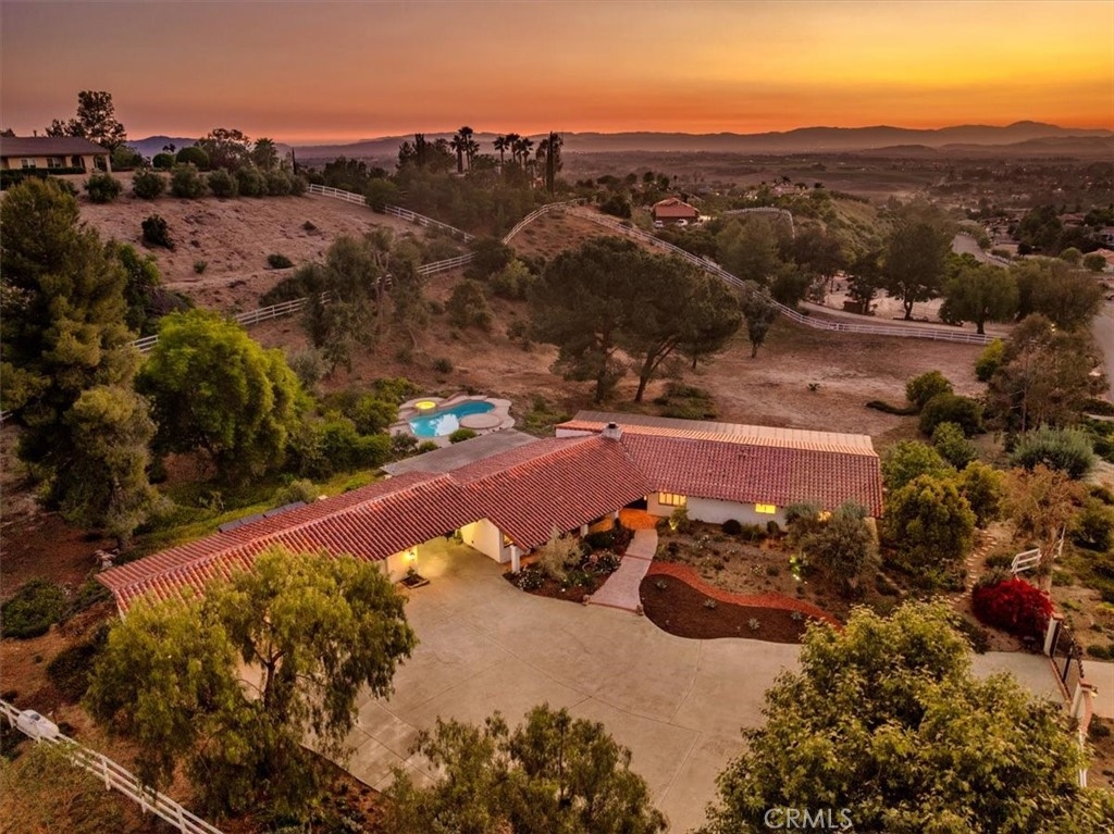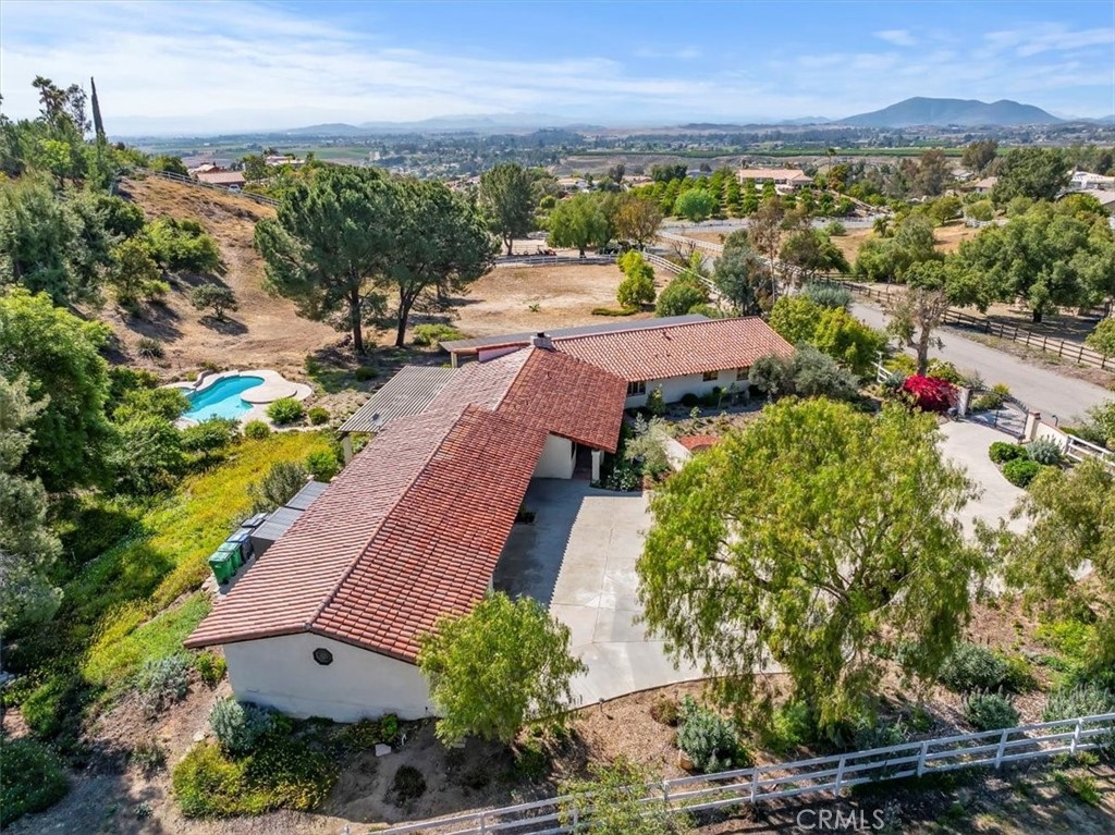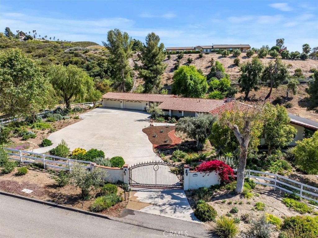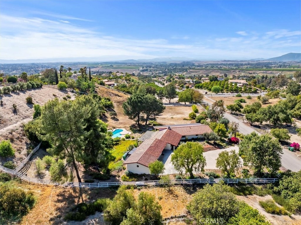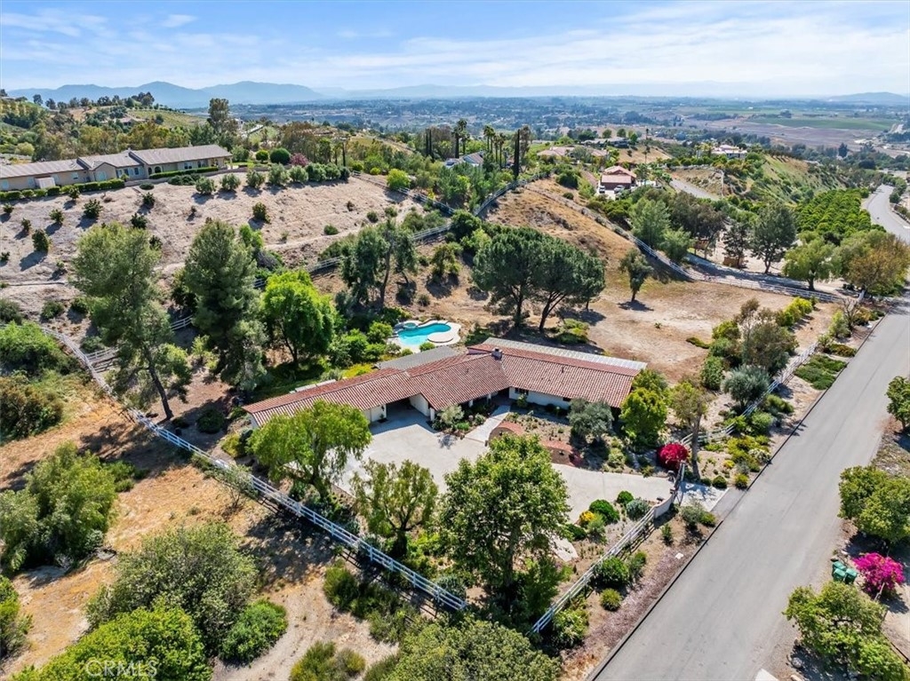 Stunning single story estate with views of vineyards and rolling hills with amazing sunsets and morning hot air balloons in the prestigious community of Glenoak Hills. Offers the perfect blend of timeless charm, luxury, and endless potential with its all usable land. Set on a fully fenced and gated 2.4 acre lot of entirely usable land, this property is a rare find. Step inside to an open, light-filled floor plan with 2,500 sq ft of living space, featuring four bedrooms and 2.5 baths. Enjoy a welcoming family room with a cozy fireplace, travertine flooring, and two French doors that open to beautiful grounds with access to the pool. The expansive living room impresses with a four-panel French door, oversized windows, and a statement chandelier. The gourmet kitchen has been beautifully remodeled with white cabinets, quartz countertops, crown molding, a coffered ceiling, and recessed lighting. The luxurious primary suite with a four-panel French door offers private patio access, a spa-inspired bathroom with granite counters, and an exquisite glass-inlay window. Plantation shutters and custom window coverings add elegance throughout. Classic Spanish architecture flows seamlessly outdoors with a clay tile roof, terracotta walkways, and a charming breezeway. The entertainer’s backyard is truly a resort paradise with the beautiful mature landscaping complete with a sparkling pool, an outdoor kitchen with bar seating and refrigerator, tranquil fountains, and an Alumawood patio cover perfect for sunset dining. Additional features include a four-car garage with a Tesla charger, a covered carport, abundant guest parking, and a newer HVAC system. This impeccably maintained estate offers exceptional potential for a guest house, ADU, horse facilities, or RV garage, tailored to your lifestyle. Community amenities include two tennis courts, a clubhouse, a horse arena, and a playground. Just minutes from Temecula’s finest wineries along the De Portola Wine Trail—including Leoness, Altisima, Fazeli, and Renzoni. Enjoy low taxes, low HOA fees, and the ultimate Wine Country lifestyle. Don’t miss this rare opportunity, homes like this seldom come available! Schedule your private tour today.