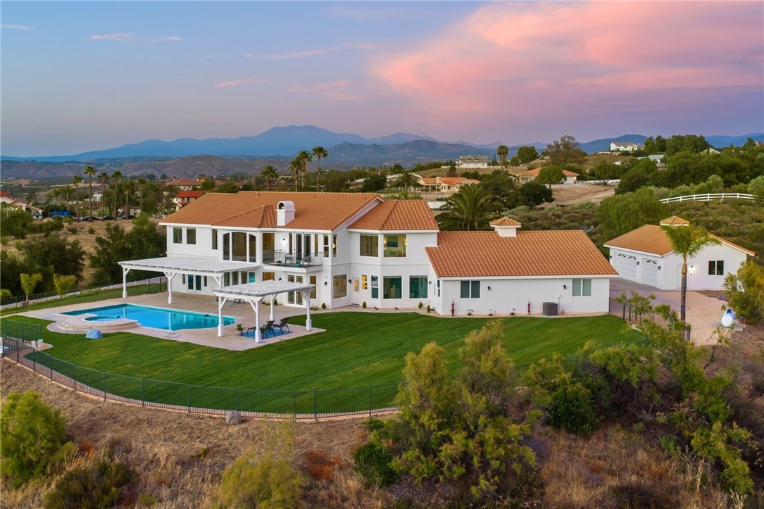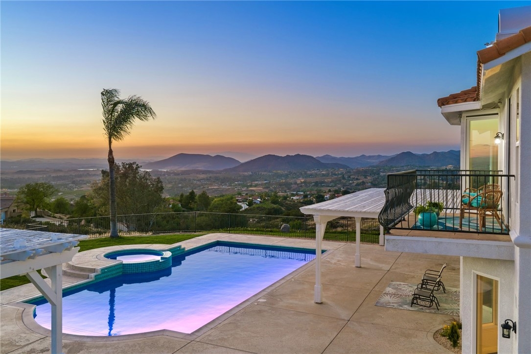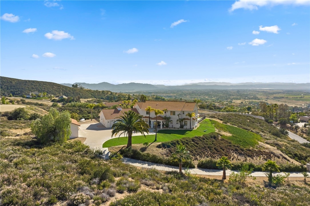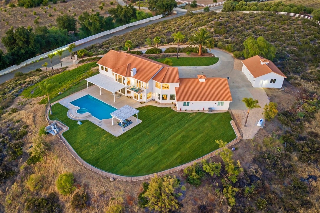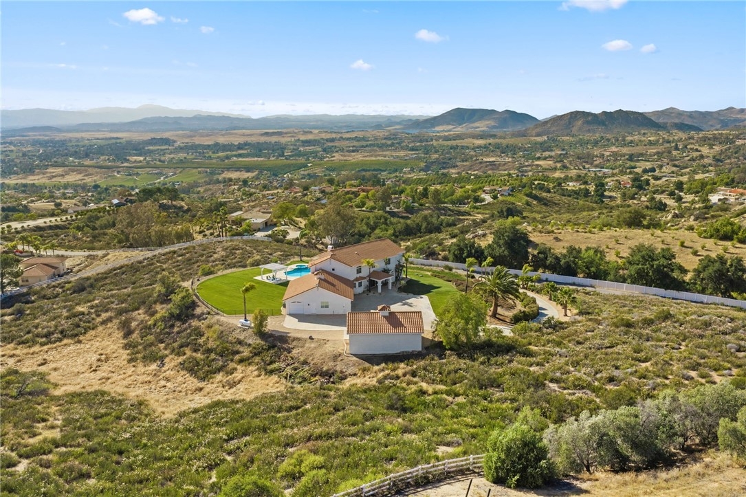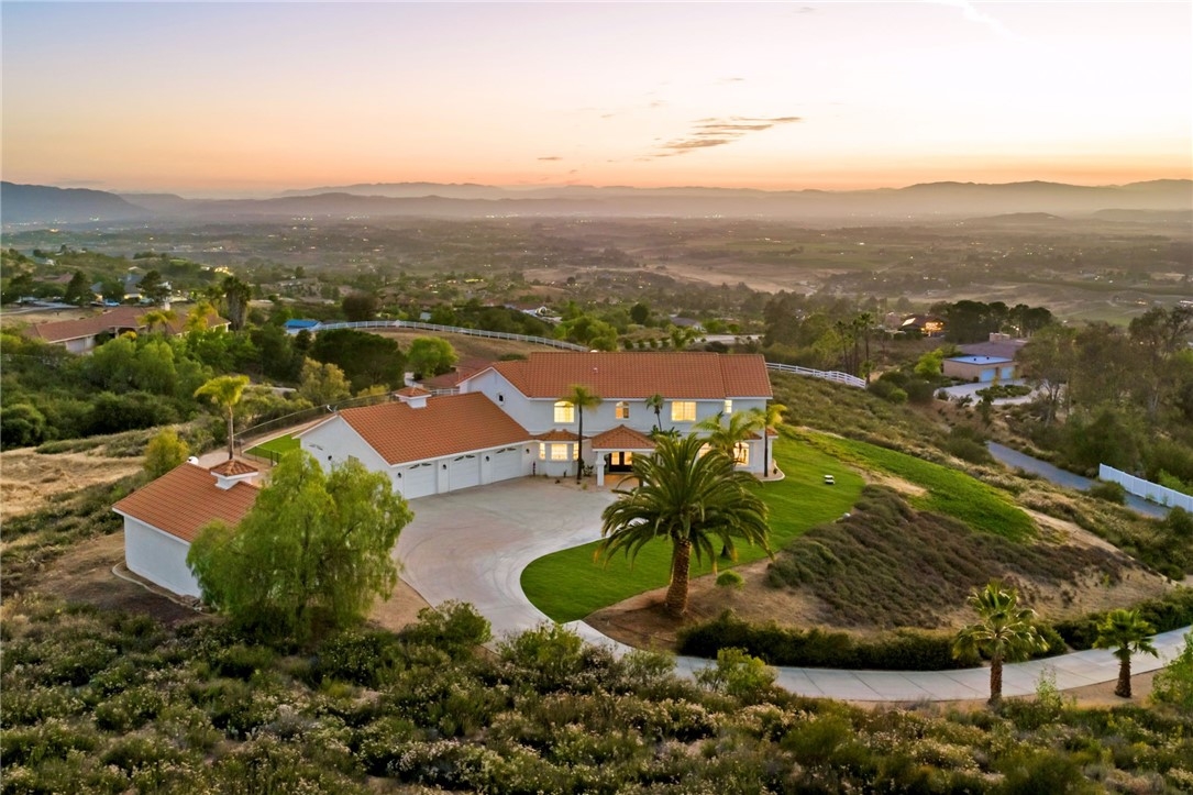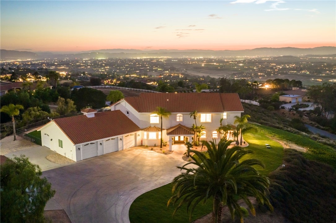 Welcome to this exceptional home in one of Temeculas most desirable locations, perched on top of a hill in Glen Oaks. With panoramic sunset views, city lights and hot air balloon sightings, this home offers a lifestyle that is truly hard to replicate. Situated on nearly 5 acres, this home was built in 2001 with a serene setting with freshly landscaped front and back lawns. The backyard is an entertainer’s dream, complete with a sparkling 43x20 pool and spa, all perfectly positioned to take in the views. Large windows throughout the home flood the interior with natural light and frame the scenery from nearly every room, while 20 foot ceilings create an open and inviting atmosphere. Spanning 4,230 sq. ft. this home features 5 bedrooms and 3.5 bathrooms, including two conveniently located downstairs bedrooms, along with a full bathroom and a guest bathroom. As you enter, you’re immediately welcomed by views of the backyard, the pool, and the bright open layout, with a central fireplace connecting the family and dining rooms. An additional downstairs room offers the perfect space for a home office with inspiring views. Car enthusiasts and those desiring extra space will appreciate the garage setup, featuring an oversized 3 car garage, an additional 2 car garage with separate access, and a detached 3 car garage, ideal for an ADU, Airbnb, workshop, or additional storage, bringing the total to 8 garage spaces. Upstairs, the layout continues to impress. The primary suite is privately situated and includes two large walk in closets, a fireplace, private balcony, spacious bathroom with dual vanities, and a versatile bonus room ideal for a nursery, office, or sitting area, all overlooking the stunning landscape. Just outside the primary suite is a conveniently located laundry room. Across the catwalk, you’ll find two additional bedrooms, each featuring spacious walk in closets and connected by a Jack and Jill bathroom. Just outside the bedroom is a library style bookshelf with lighting and continued views completing this thoughtfully designed space upstairs. Original owners have made numerous updates adding comfort and efficiency to the home. Ideal location in Glen Oaks, with paved roads, without the burden of HOA, this home offers low taxes, close proximity to wineries, and a setting that captures the very best of Temecula living. This is truly a special property that must be experienced in person. This is truly a special property that must be experienced in person.