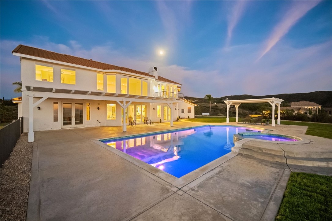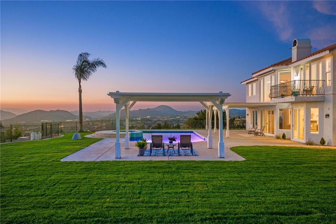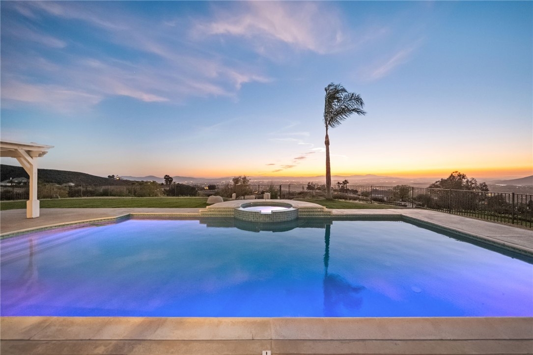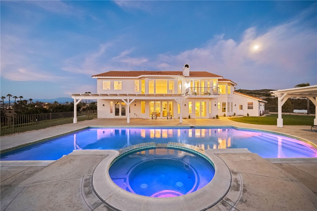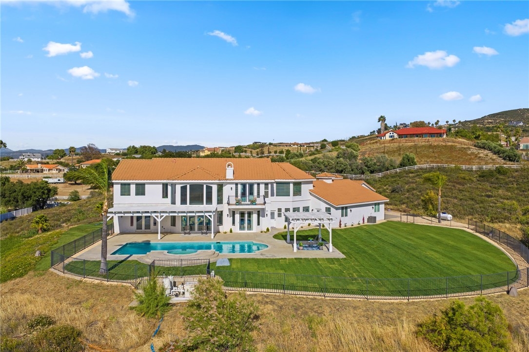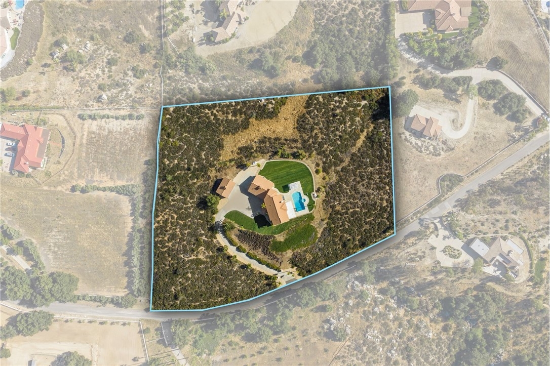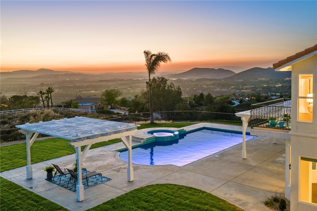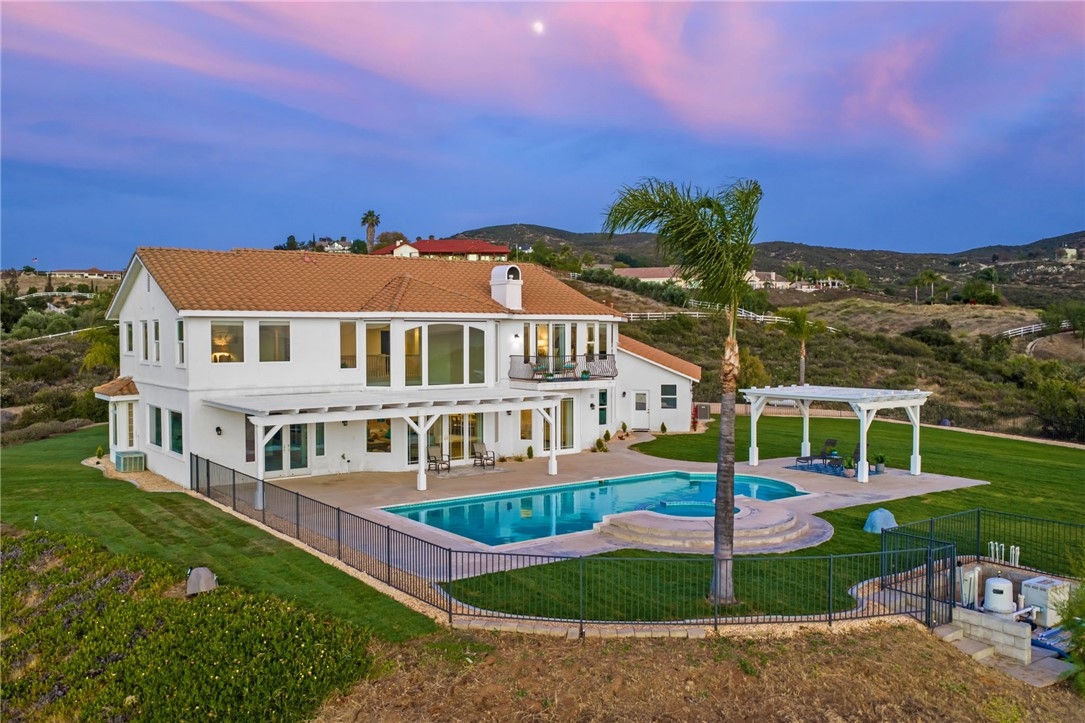Welcome to this exceptional home in one of Temeculas most desirable locations, perched on top of a hill in Glen Oaks. With panoramic sunset views, city lights and hot air balloon sightings, this home offers a lifestyle that is truly hard to replicate. Situated on nearly 5 acres, this home was built in 2001 with a serene setting with freshly landscaped front and back lawns. The backyard is an entertainer’s dream, complete with a sparkling 43x20 pool and spa, all perfectly positioned to take in the views. Large windows throughout the home flood the interior with natural light and frame the scenery from nearly every room, while 20 foot ceilings create an open and inviting atmosphere. Spanning 4,230 sq. ft. this home features 5 bedrooms and 3.5 bathrooms, including two conveniently located downstairs bedrooms, along with a full bathroom and a guest bathroom. As you enter, you’re immediately welcomed by views of the backyard, the pool, and the bright open layout, with a central fireplace connecting the family and dining rooms. An additional downstairs room offers the perfect space for a home office with inspiring views. Car enthusiasts and those desiring extra space will appreciate the garage setup, featuring an oversized 3 car garage, an additional 2 car garage with separate access, and a detached 3 car garage, ideal for an ADU, Airbnb, workshop, or additional storage, bringing the total to 8 garage spaces. Upstairs, the layout continues to impress. The primary suite is privately situated and includes two large walk in closets, a fireplace, private balcony, spacious bathroom with dual vanities, and a versatile bonus room ideal for a nursery, office, or sitting area, all overlooking the stunning landscape. Just outside the primary suite is a conveniently located laundry room. Across the catwalk, you’ll find two additional bedrooms, each featuring spacious walk in closets and connected by a Jack and Jill bathroom. Just outside the bedroom is a library style bookshelf with lighting and continued views completing this thoughtfully designed space upstairs. Original owners have made numerous updates adding comfort and efficiency to the home. Ideal location in Glen Oaks, with paved roads, without the burden of HOA, this home offers low taxes, close proximity to wineries, and a setting that captures the very best of Temecula living. This is truly a special property that must be experienced in person. This is truly a special property that must be experienced in person.
