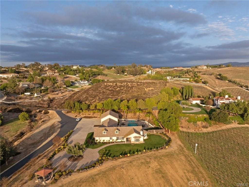 Nestled in the heart of the renowned Temecula Wine Country, this stunning single-story home offers a rare opportunity to live among the region’s most celebrated wineries including Falkner, Akash, and Long Shadow. Enjoy breathtaking panoramic views of the picturesque vineyards and the gentle sight of hot air balloons soaring across the sky, nearly every day. The location simply doesn’t get any better than this. Boasting 2,845 square feet of living space, this home sits on a generous 2.27-acre lot, with four spacious bedrooms, each featuring scenic views, this residence offers an inviting, open atmosphere. The expansive 2,006-square-foot garage with 12-foot ceilings and dual bays provides ample room for your RV, boats, or any of your hobbies—making this property truly a dream for enthusiasts of all kinds. Inside, you’ll find travertine flooring throughout. All of the bedrooms are generously sized, each offering its own stunning view of the surrounding vineyards. The cozy family room features a wood-burning fireplace and the chef’s kitchen is equipped with Corian countertops, an abundance of cabinetry, and a double oven, ideal for cooking and hosting.The home also boasts newly landscaped grounds, including a custom-engineered 30x30 paved driveway that leads to a 12x12 sitting area with a custom gazebo—perfect for outdoor relaxation. The backyard, complete with pavers and lush planters, offers a perfect spot for unwinding or entertaining guests by the sparkling pool and spa. An Alumawood patio cover with fans ensures comfort on warm summer days, making the outdoor space even more inviting. The property also offers a new asphalt private road, providing easy access and privacy. Additionally, there’s a graded space ideal for an ADU or shop, allowing for endless possibilities. Recent upgrades include a new roof job completed in 2024, a brand-new HVAC system, and a reverse osmosis and Kagan PH Alkaline Water System. Other thoughtful touches include two whole-house fans, a hot water circulation pump, ceiling fans, and cased windows throughout the home. Step outside to unwind and watch hot air balloons float gracefully over the vineyards. Enjoy peaceful walks to nearby wineries or simply bask in the tranquility and stunning scenery from your own backyard. Whether you’re entertaining guests or savoring a quiet evening, this home offers the ultimate Temecula Wine Country lifestyle.
