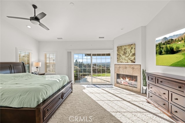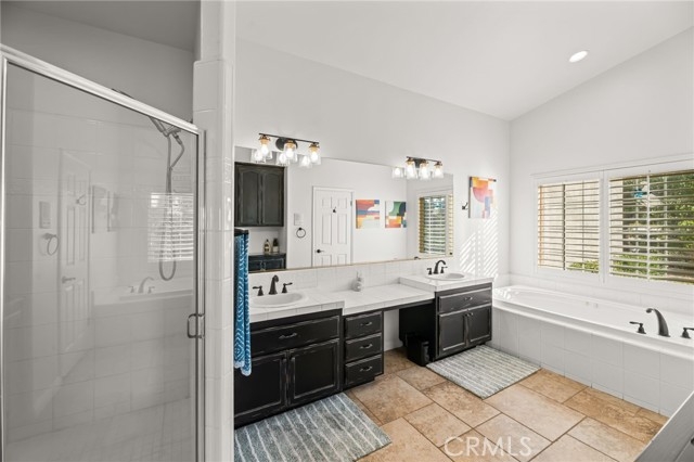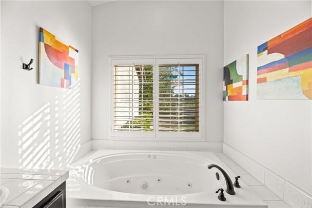 The luxurious primary suite features vaulted ceilings, a large walk-in closet, and a spa-style bathroom with dual vanities, a Jacuzzi soaking tub, and a walk-in shower—all with sweeping views just beyond the window.