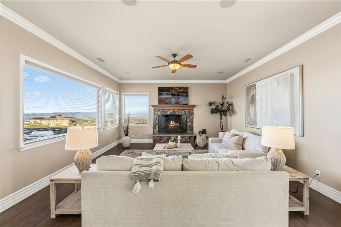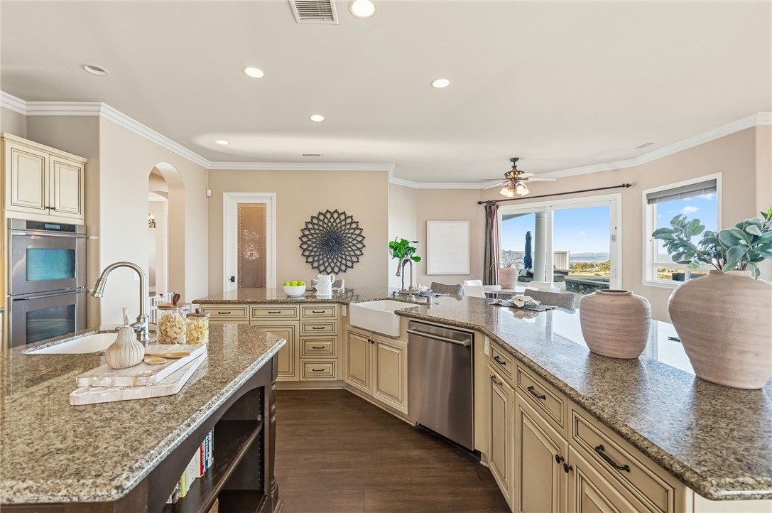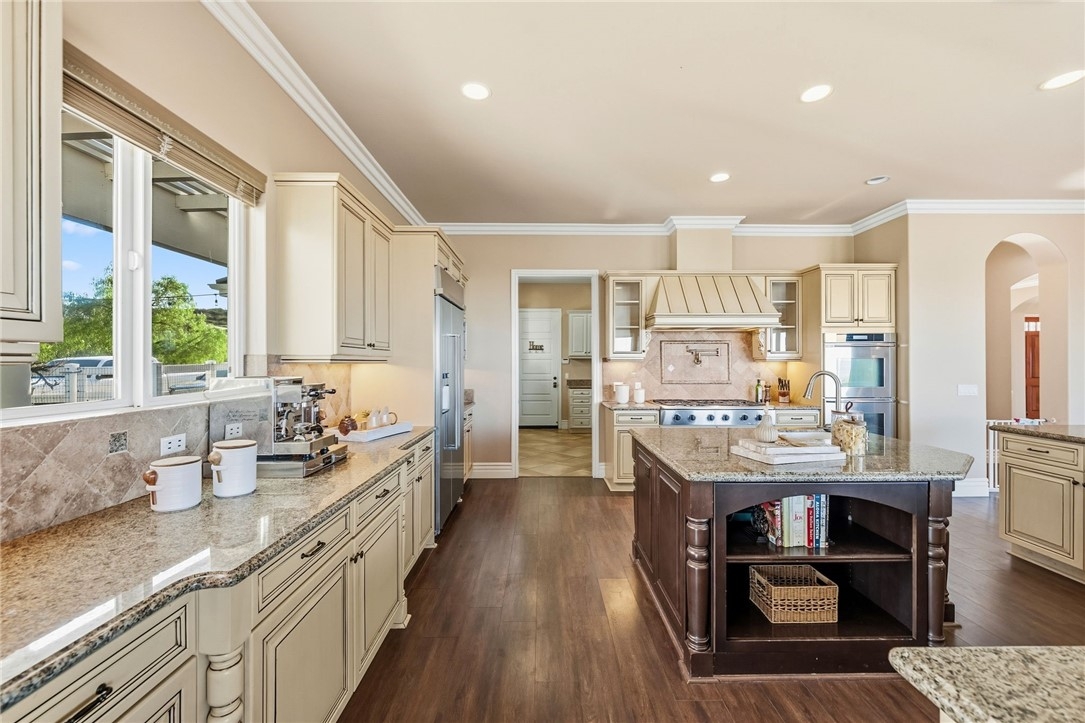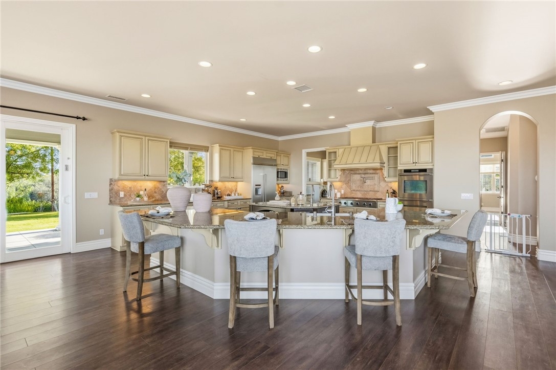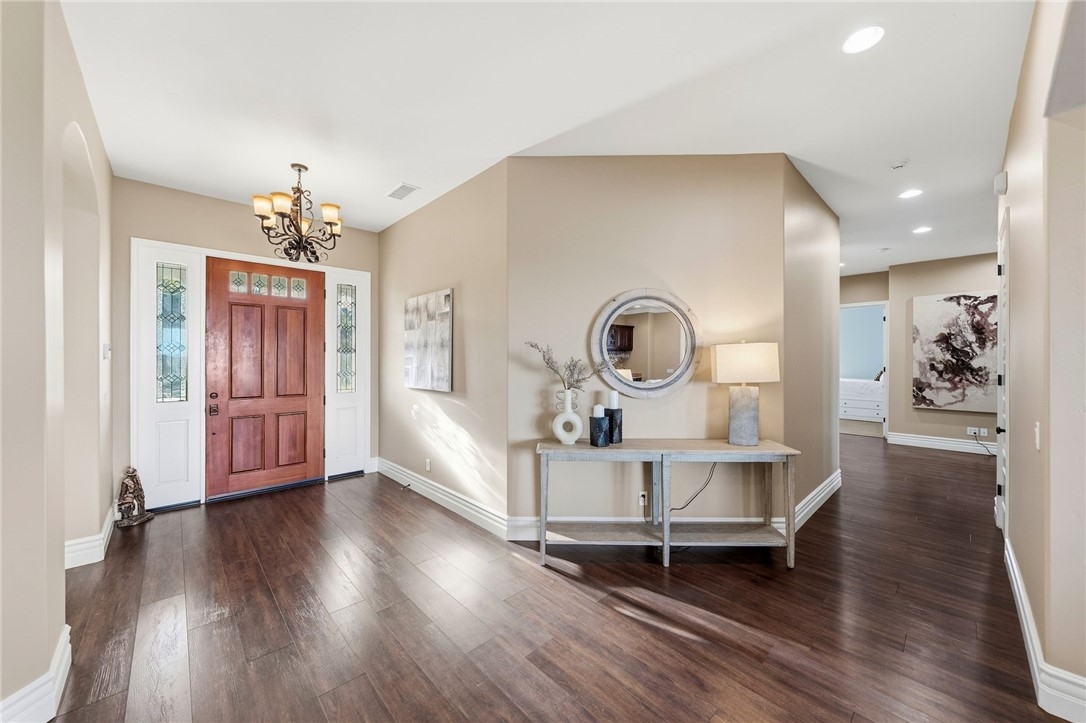 BACK ON MARKET, NO FAULT OF SELLER! Welcome to this stunning single story custom estate perched high above Temecula’s Wine Country, offering unobstructed panoramic views of vineyards, Lake Skinner, hot air balloons, and sunsets. Spanning 4,562 sq ft, this 5 bed, 3.5 bath home was thoughtfully designed by its original owners and built in 2006 with an incredible floor plan and high end finishes throughout. You’re greeted by soaring ceilings, crown molding, and a direct line of sight to the sparkling pebble tech pool through oversized sliders. The formal living room features a fireplace, bar, and serene backyard views, perfect for entertaining. The right wing offers a formal dining room, private office or 5th bedroom, bathroom, and a massive kitchen that opens to the dining nook and family room with another fireplace. The chef’s kitchen boasts expansive counters, a large island with bar sink, six burner cooktop, double ovens, built in fridge, and walk in pantry, plus abundant storage and an oversized laundry room. The left wing includes four bedrooms, including the luxurious primary suite with its own fireplace, backyard access, and oversized en-suite with huge walk in shower, jetted soaking tub, and large closet. Two bedrooms share a dual sink bath, while the fourth is a junior suite with its own full bath. This home has 2x6 framing with full insulation, 2 recently replaced on demand water heaters, A Halo whole house water filtration, central vacuum with floor sweeps (kitchen, primary bath, laundry) plus a garage car kit, dual AC units with independent zoning (including office control), and recently replaced AC units and built in fridge. Energy efficiency shines with a ground-mounted 35-panel solar array prepaid through 2035 and a solar pool heater. Benefit from a low ~1% tax base and no Mello-Roos or water-bond assessments, the bond was paid in 2007. The oversized 3-car garage offers ample space for storage or toys. There’s also an unfinished attic with 9-ft ceilings accessed via telescoping ladder in the pantry. Step outside to an entertainer’s backyard featuring a pool & spa with incredible sunset views, lush lawn with putting green (former sand trap replaced with mulch and new planting), and a large flat pad ideal for an RV garage, equestrian setup, or future ADU—all oriented toward the views. Set in one of Wine Country’s most desirable and private pockets, this home perfectly blends luxury, function, and jaw-dropping views.